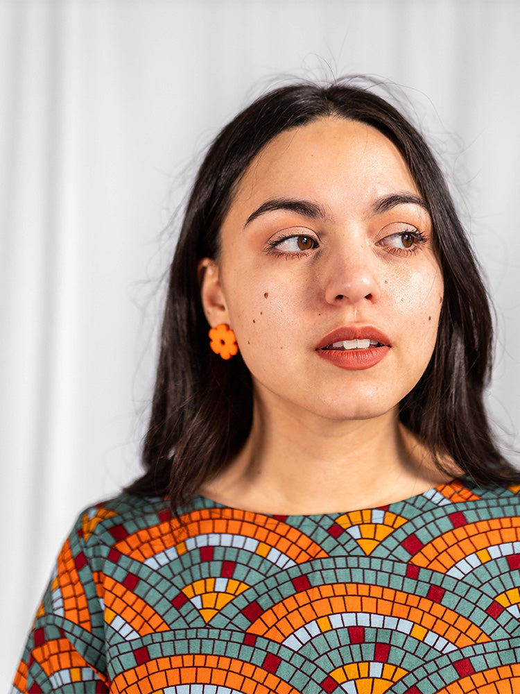 Your go-to short sleeve midi dress is ready for cooler weather! This Mata fan favorite is cut from a smooth satin weave cotton in a colorful print, featuring elastic ruching at the waist for a cinched look with a comfortable fit.