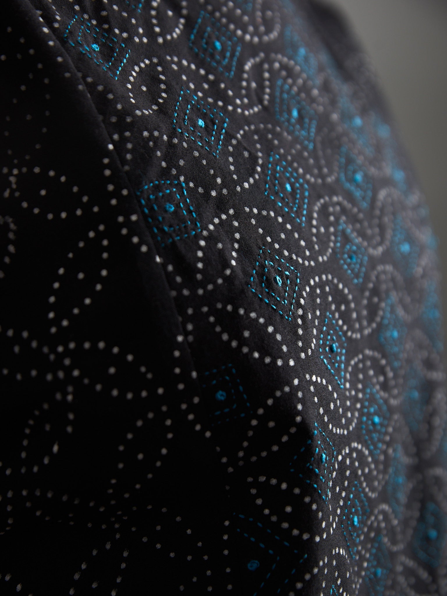 The layering of a geometric dot print and hand embroidered blue diamond designs make the Cara Top an interesting visual piece. Try this relaxed cotton top for a versatile option with any outfit.