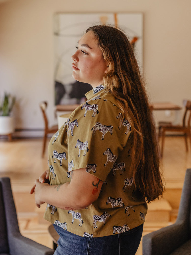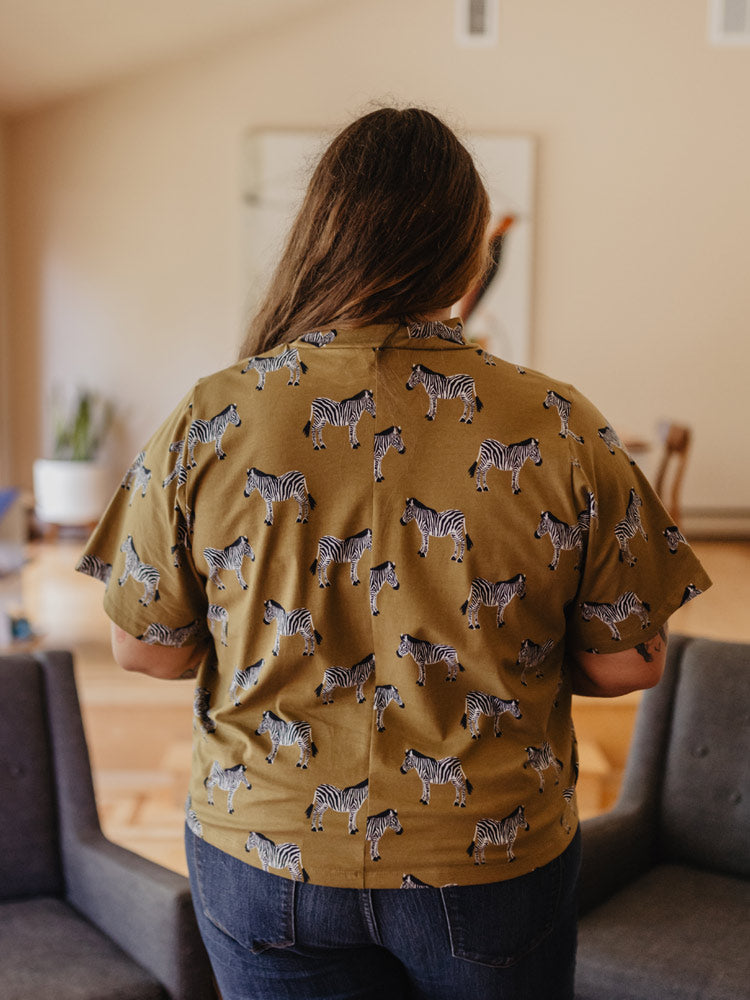 This mock neck tee features a playful zebra print, cut from our stretchy organic cotton jersey. Pair with comfy pants to relax to the max, or dress up with denim and heels.