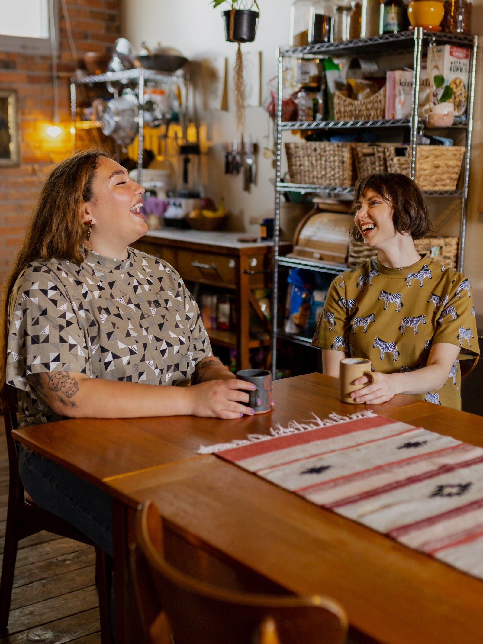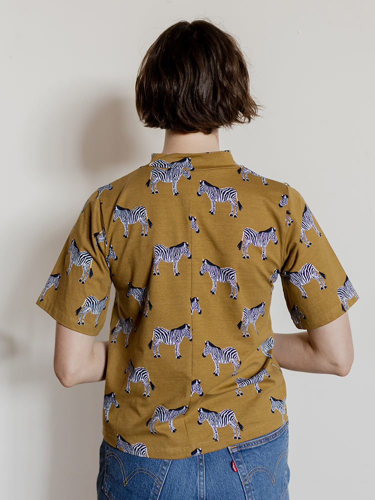 This mock neck tee features a playful zebra print, cut from our stretchy organic cotton jersey. Pair with comfy pants to relax to the max, or dress up with denim and heels.