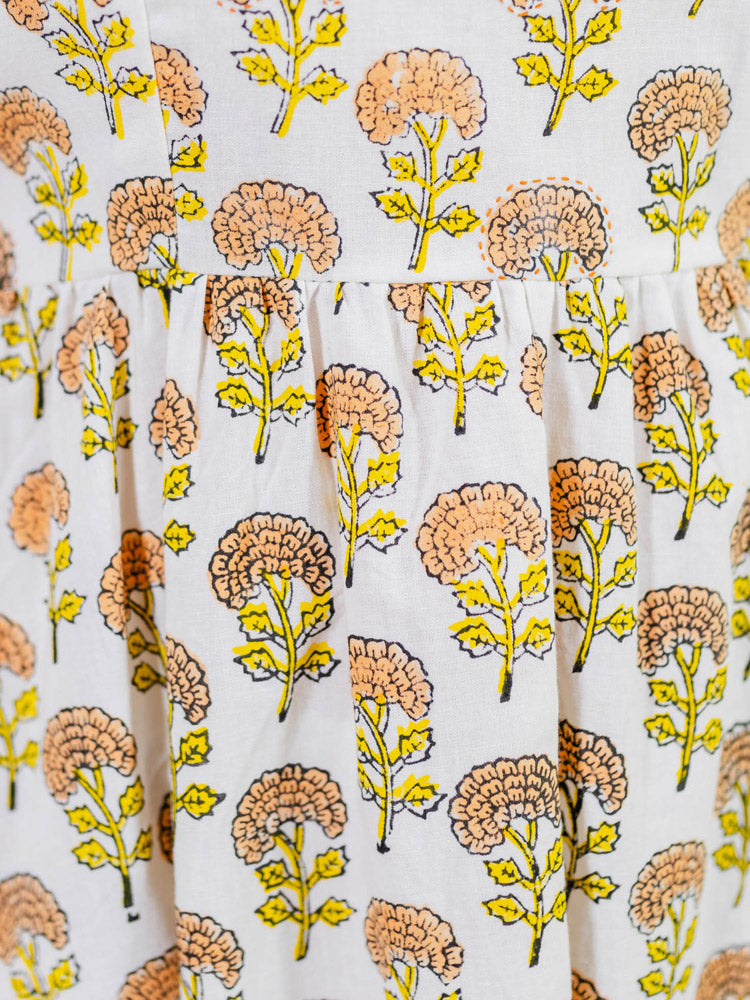This dress with pockets is sweet and stylish, with those standout Mata details that make it special. The leafy motif is hand printed on 100% cotton and adorned with a running stitch of subtle orange embroidery along the blooms. Hidden pockets keep everything you need close at hand! This fit and flare dress zips up the back for a more fitted top that flows into a looser skirt.